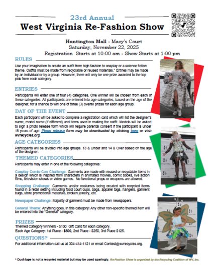 Since 1999, the Recycling Coalition of WV, Inc. has been advocating recycling and West Virginians to make purchasing decisions based on recycled content or the ability to recycle the material once the product has completed its useful life. We coordinate annual programs like the ReFashion Show, give prizes for participants who sign a pledge to support recycling, sponsor youth contests, provide teacher lesson plans on trash and recycling.